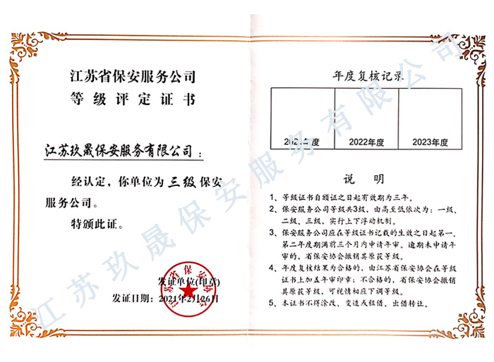 江蘇玖晟保安服務有限公司成立于江蘇省昆山市千燈鎮。注冊資金:5000萬,是擁有省公安廳頒發的保安服務許可證的企業【蘇公保服20170046】,也是昆山市保安協會常務理事單位。